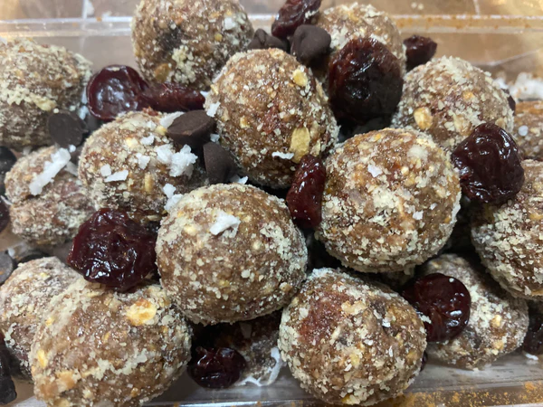 Gluten free steel rolled oats, natural peanut butter, protein power, collagen peptides, honey, coconut oil, coconut water, dried cherries, dark chocolates chips, cinnamon, and some secret spices!